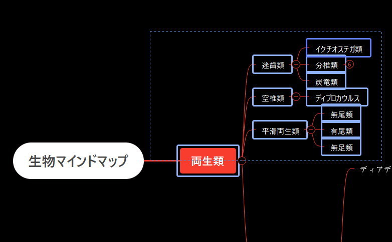 ↑上の図は両生類の分類についてまとめたマインドマップの一部です。この実例を使って解説していきます。